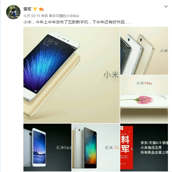 小米雷军表明小米手机第三季度还会继续有好著作(照片取自微博)